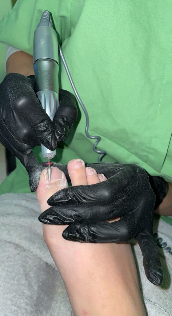 Im Fußbad ist ebenso Desinfektion, wie auch der Fuß nach der Behandlung mit milder Haut Desinfektion besprüht wird.